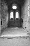 Fountains Abby, c. 1100s. South transcept, outer chapel with champfered windows below an oculus.